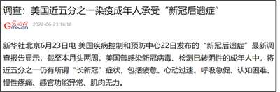 美国疾病中心在6月22日就发布过新冠后遗症的调查报告,其中感染新冠后并转阴的成年人里,仍然有1/5有“长新冠”症状,包括疲惫、心动过速、呼吸急促、认知困难、慢性疼痛、感官功能异常、肌肉无力。