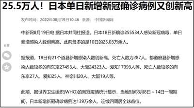 8月18日,日本是新增25.5万人感染,新增死亡人数287人。