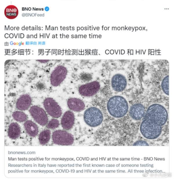 共存下的惊吓! 据荷兰BNO新闻网8月23日报道,意大利研究人员日前报告该国一名男子同时检出感染了猴痘病毒、新冠病毒和艾滋病病毒,据称,这是全球首例集此三种病毒于一身的已知病例。