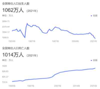 可能很多人看到负增长有点懵,什么是负增长?就是人口的出生率低于人口的死亡率。2021年我国的出生人口是1062万,死亡人数达到了1014万,正处于缓慢爬升阶段。