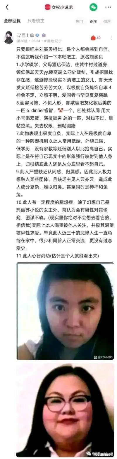 从“女权吧”自己公开的介绍和网友扒出的证据,该吧主网名阿娜,真实姓名刘XX,IP地址是上海,现已是年近三十的女性,受教育程度较低(小学辍学),父母在酒店做保洁,家庭条件较差。但她却没有正式工作,长期待在家里在网上找存在感,她注册了两个号遥遥相呼应,以贬低劳动者来掩饰自己的自卑,试图融入某类人群,而且她还患有臆想症。