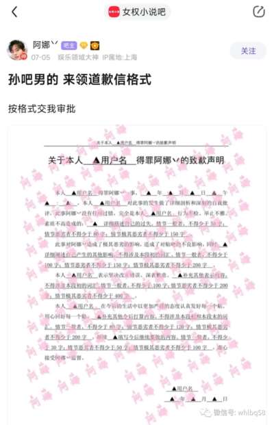【“女权小说吧”吧主要求批评他的人写“道歉信”的截图】