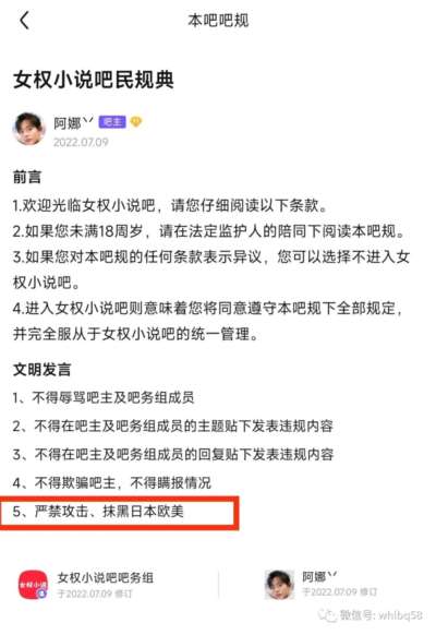 在“女权吧”的“民规典”(即“吧规”)中,第5条写到:“严禁攻击、抹黑日本欧美”,可谓观点鲜明。
