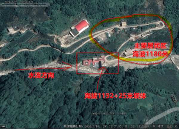 从卫星地图上可以看出,水流方向是由西向东的,水电站所在地的海拔为1192米,最大坝体高度25米,最大库容8.6万立方米。而湾东村的主要居民区,而我们看到水电站东北方向,就是一排主要居民区,海拔1180米左右。