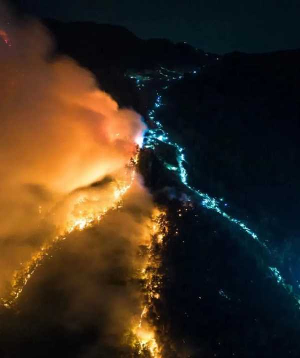 就像前段时间重庆山火的时候,@摄影周瑄拍了这样一张照片,灭火队伍组成的蓝色光带和山火的红色光带彼此相持,而山城的志愿者们集聚山下,不眠不休地帮助消防队员运送灭火物资,补充补给,也是因为,背后就是自己的家园。