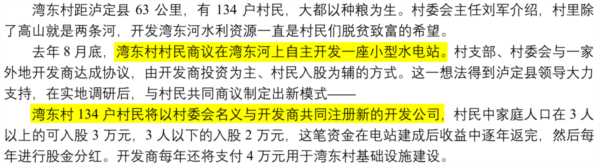 134 户村民缴纳一定的入股资金,参与当地水利开发——湾东河边村民成水电站股东: _