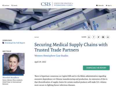 2020年12月,美国战略与国际问题研究中心(CSIS)提出建立“可靠供应商网络”(Trusted Supplier Network)的政策建议,旨在推进美国和西半球国家的各项供应链(包括医疗产业)的合作。该报告指出,如果盲目推行自给自足的目标,推出政策要求所有重大疫情相关医疗产品都在美国制造,结果只会导致价格上涨并产生更多短缺。因此,美国需要引入更广泛的西半球供应链合作对象。现在这份报告将是2020年建议的细化和完善。