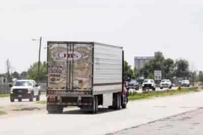 2021年6月,一辆带有JBS标牌的卡车在位于科罗拉多州格里利的牛肉生产厂附近行驶。JBS是世界上最大的牛肉生产商 | 图片来源:迈克尔·恰格洛拍摄/彭博新闻社
