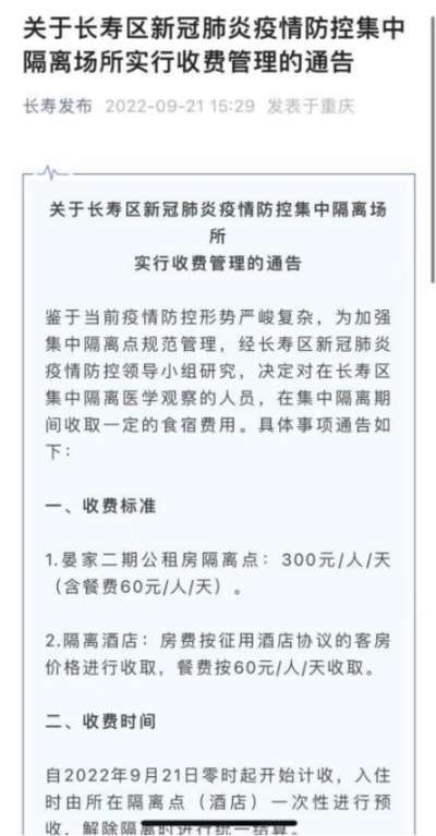 重庆长寿区是9月21日发布的关于新冠防控集中隔离场所收费管理的通告。