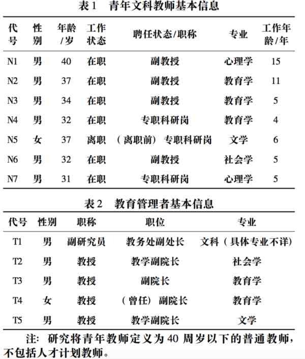 尽管教师的行动选择是可见的,但是行动背后所遵循的逻辑却是隐藏的,因此研究采用质性研究的方式深挖现象背后的含义。本研究采取目的性抽样与方便性抽样,选取N大学的文科青年教师作为研究对象。N大学是国内一流综合性研究型大学,以基础学科见长,文科历史悠久,根基深厚。确定N大学之后,在综合考虑专业、聘任状态、职称等因素后,借助自主邮件联系以及滚雪球的方式选取了7名文科青年教师、4名学院副院长以及一名教务处副处长,选取后两类群体的原因是他们分别代表院系、校级层面意见(见表1及表2)。