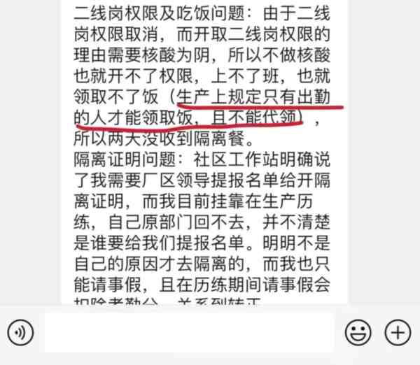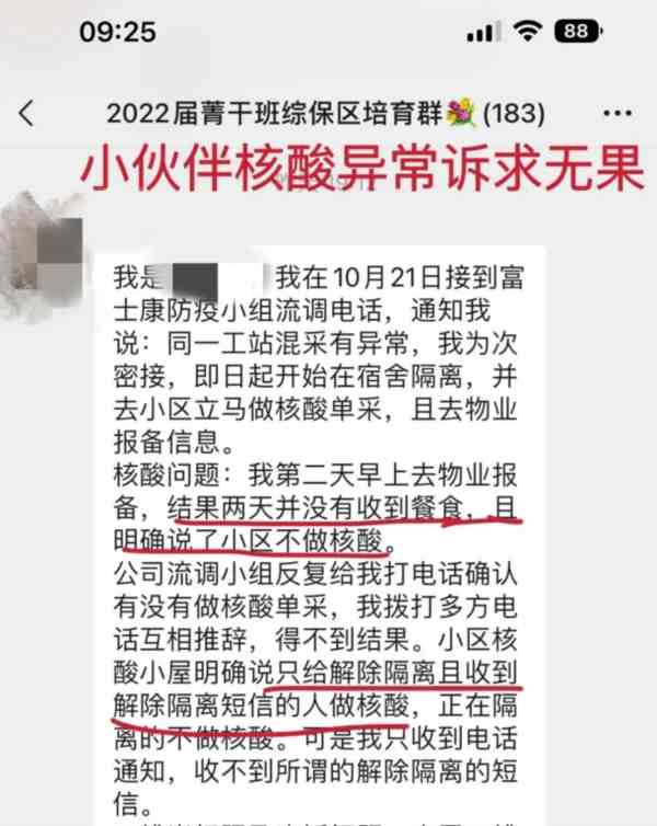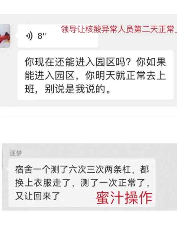 这周疫情尤为严重,有小组待的车间出现了混管阳性,由于每个车间核酸点都是固定的,那么说明该车间内必有阳性。出现阳性病例之后,该小组很害怕,不敢进车间上班了,但是管我们的领导依然强烈要求要进入车间,继续定岗定位。他们听了领导的话,紧接着,他们的核酸也出现了异常。我们听到这个消息,感觉都很慌张,第一次感觉疫情离我们这么这么近。可是出现异常的人员并没有被拉走,而是一直待在宿舍,等了好几天也没有人上门单采。再然后,菁干班出现核酸异常的人员越来越多,混阳人员不止个例,但是这时候的处理方式直接是放任不管,可以正常上班,甚至有的密接者没有去处,无家可归,没人管,向领导反映,也很久才进行安排,最终在男寝一个宿舍打了地铺。