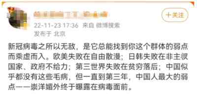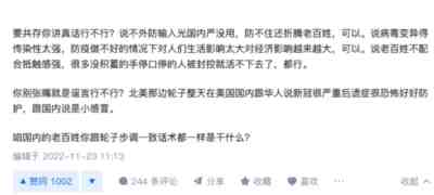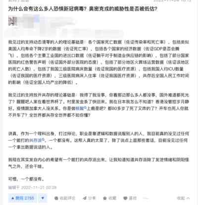 比如一些人说“经济和自由比生命代价重要”,虽然我不同意这种比较方式,但起码这个观点承认了存在“生命代价”。但当有很多人不断试图让大众相信“放开了没有代价”,“国外日子像花一样”,“顶多死老人”,以此为依据鼓吹放开,那么在这基础上的讨论就没有了意义,这些人的一切言论动机,就是为了让中国彻底放开防疫,为了达成这个目的,不惜让普通人毫无心理准备的去面对可能的冲击,代价显然不是他们考虑的。