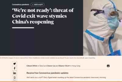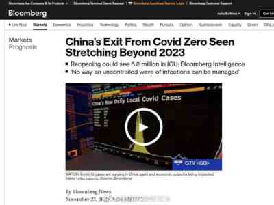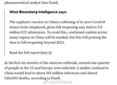 显然这位专家清楚中国马上放开有什么后果,西方也清楚。彭博社11月23号一篇文章表示,中国放弃清零可能会导致580万人进入重症监护病房,使目前每10万人拥有不到四张ICU病床、远低于发达国家水平的卫生系统不堪重负。预计每日ICU入院人数将达到32,000人,预计在六个月内将导致约3.63亿人感染,近62万人死亡。