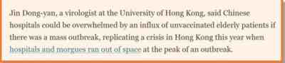 比如一直鼓吹放开的香港专家金冬雁,这位是国内某几家媒体最喜欢采访的专家之一。他在11月18日接受FT采访时表示“如果疫情大规模爆发,中国的医院可能会因未接种疫苗的老年患者不断涌入而发生挤兑(overwhelmed),重演今年香港的危机,当时(香港的)医院和停尸房在疫情高峰全线爆满。”而在11月20接受国内某媒体采访时又表示:“现在的重症率和死亡率这么低,不可能造成挤兑。”