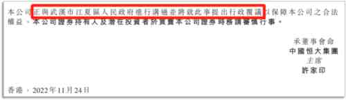 在昨晚的公告最后,恒大表示,正与武汉市江夏区人民政府进行沟通,并就此事提出行政复议。
