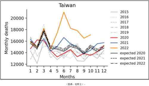 下图的橙色曲线,就是对岸今年的每个月死亡人数,其他颜色曲线是往年的死亡人数。