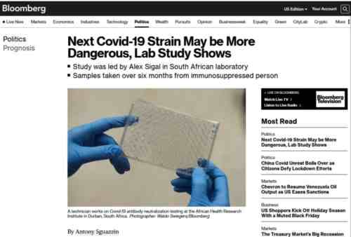 11月27日,俄罗斯在截获乌克兰准备在战场上投放生物病毒武器消息后,连续发布在前期占领哈尔科夫和马里乌波尔美国机密生化实验室获得的,美国生物武器开发机密文件。其中美国媒体10月,公开波士顿大学国家新兴传染病实验室(NEIDL),在奥密克戎和新冠原始毒株基础上,基因组合了一种“致死率高达80%”的新毒株。实际上那段时间,美国走狗英国,位于苏格兰的生化实验室还同步合成了传播性极高的“流感+RSV(合胞病毒)”组合病毒。