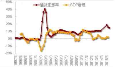 我们在图上看到1998年至2003年,2008年至2010年,2012年至2015年,连续多年,阿根廷经济增速都已经降至0附近,与此同时,通货膨胀率高企,都达到了10%,在2015年甚至接近20%。