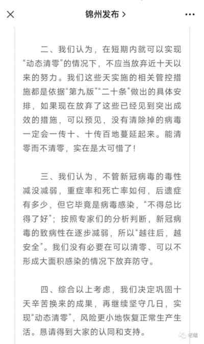 今天更有趣了,锦州官方平台“锦州发布”今天发文表示,能清零而不清零,太可惜,所以不应该放弃此前的努力,务必要实现清零,恳请得到市民的认同和支持。原文见下图: