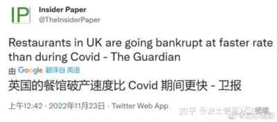 英国《卫报》上周发了一篇报道,说英国餐馆倒闭的速度竟然比Covid期间更快。这里需要解释一下,事实上三年来一直都是Covid期,但是英国已经躺平了,他们说新冠大流行已经结束了,所以躺平前叫Covid期,现在不算Covid期。