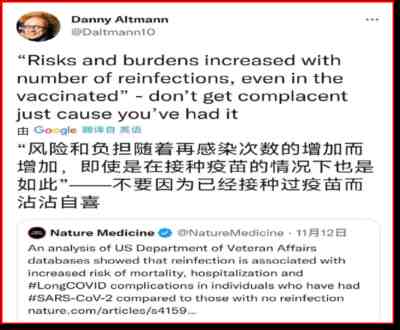 世界科学期刊《自然》杂志11月10日发表的一项研究也表明,无论是否接种疫苗,患者多次感染新冠病毒后,会导致死亡、住院及严重健康问题的风险显著增加。