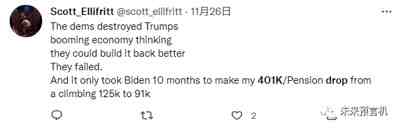 翻译:民主党摧毁了特朗普,鼓吹经济思维,说他们能更好地重建。结果他们失败了。拜登只用了10个月,就把我的401k退休金从正在上涨的12.5万美元干到9.1万美元。