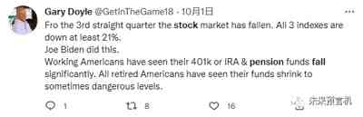 翻译:连续第3个季度,股市下跌,所有3大指数全部下跌至少21%。这是拜登干的。辛勤工作的美国人看着他们的401k和退休金显著下跌。所有退休的美国人看着他们的退休基金缩水到危险的程度。