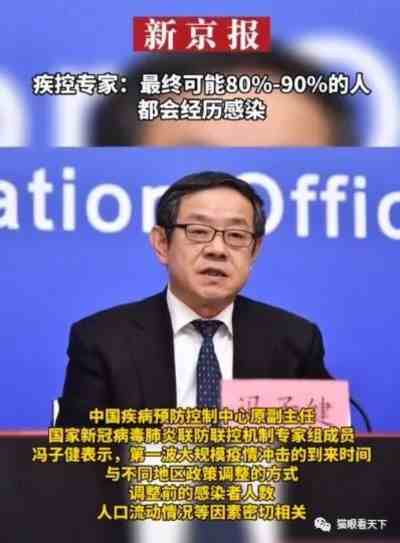 还看到另一个版本,是网友们耳熟能详的媒体新京报报道的,他说,疾控专家:最终可能80-90%的人都会经历感染。