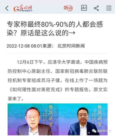 这家媒体一直以来的报道,可信度有多少,人们都心里有数。随后光明网发布了一条新闻,标题是《专家称最终80-90%的人都会感染?原话是这么说的》,还原了当时说这句的完整表述。