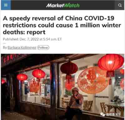 外国尤其是反华先锋美国的媒体又是如何评论中国最新的防疫政策的?近日,美国媒体《MarketWatch》发表评论:中国过快放松新冠控制可能在今年冬天就导致100万人死亡。这样的论断,是危言耸听,还是有依据的预言,目前尚不得而知。但我们都不会忘记,美国媒体之前大量内容都是抨击中国的严格抗疫,现在又集体掉转枪口攻击中国放松封控,他们的逻辑总而言之都是中国必输。