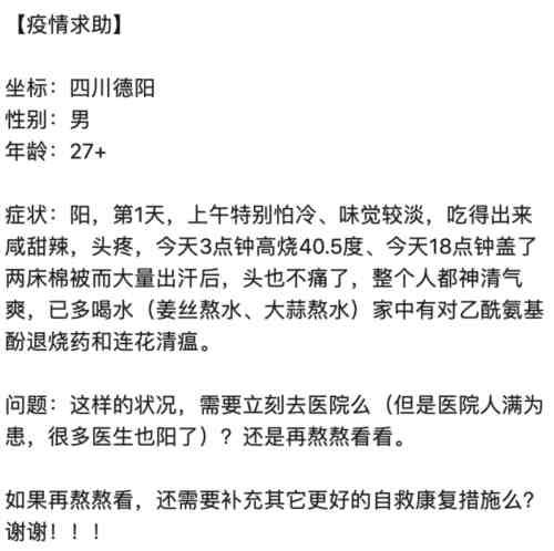 我评论说:应该说,这位年轻男士做的非常对。出汗。喝姜 蒜水。都是标准动作。而且他高烧到40度,其实说明他身体好,阳气旺,与病毒的战斗十分激烈,也打了个速战速决。 很好[强] 后面就是好好休息,好好饮食调养,将消耗的气血补回来。