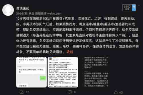 12岁男孩在感染新冠后用布洛芬+抗生素,次日死亡。点评:强制退烧,逆天而动,凶。小男孩本该阳气旺盛,如果顺势而为,喝点温水/糖盐水/姜汤水/治感冒的中成药,帮助免疫系统战斗,应该能顺利出汗退烧。但两种药都是逆天而行,给免疫系统强制退火(布洛芬是在指挥中枢,抗生素是直接对线粒体釜底抽薪减少产热)。但是体内还有病毒,免疫系统识别后还想要运行发烧程序,这就是产生了冲突和混乱,身体想发烧但被强力摁住。结果... 所以,要善待身体,懂得身体的语言,发烧是身体的斗争,不要简单粗暴地见烧退烧。