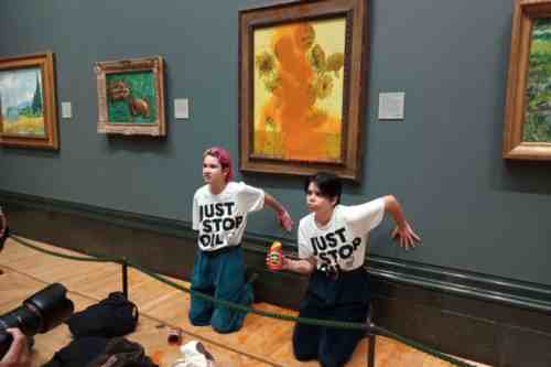 10月14日,两名气候变化抗议组织的年轻成员21岁的菲比·普卢默和20岁的安娜·霍兰德脱下外套,露出“Just Stop Oil”(停止石油)字样的T恤,然后将藏在身上的番茄汤泼在了梵高的《向日葵》上,随后并把手涂满胶水粘在画作下方的墙上。事情发生之快令所有观众都措手不及瞠目结舌。