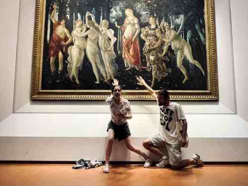 2022年7月22日,意大利佛罗伦萨乌菲齐美术馆,来自“最后一代”(Ultima Generazione)组织的抗议者将手粘在波提切利作品《春》的玻璃上。