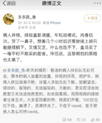 但是12月5日,她说完这些话仅仅2天之后,她所在的医院病人井喷了,她的工作量骤然加大了,比当初防疫的时候工作量还大,她又怒了,又发文抱怨。