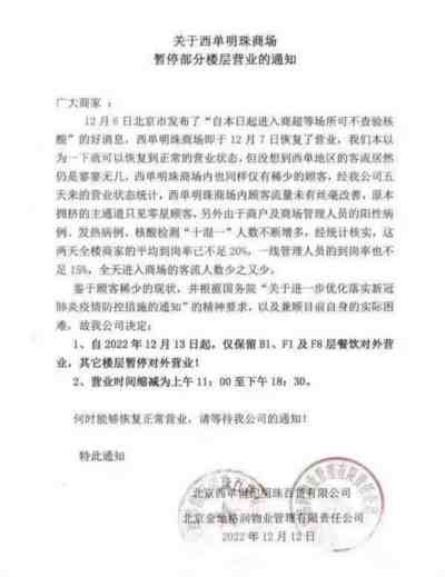 这并不是深圳独有的现象。北京西单明珠商场在12月12日发布通知,暂停部分楼层营业,理由是西单明珠商场于12月7日恢复了营业,他们“本以为一下就可以恢复到正常的营业状态,但没想到西单地区的客流仍然是寥寥无几”,他们公司:“五天来的营业状态统计,西单明珠商场内顾客流量未有丝毫改善。”因为放开,“全楼商家的平均到岗率已不足20%,一线管理人员的到岗率也不足15%,全天进入商场的客流人数少之又少。”