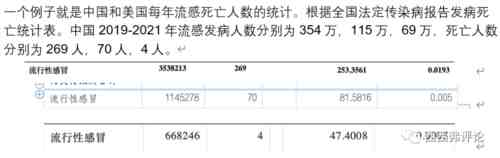 一个例子就是中国和美国每年流感死亡人数的统计。根据全国法定传染病报告发病死亡统计表。中国2019-2021年流感发病人数分别为 354万,115万,69万,死亡人数分别为269人,70人,4人。