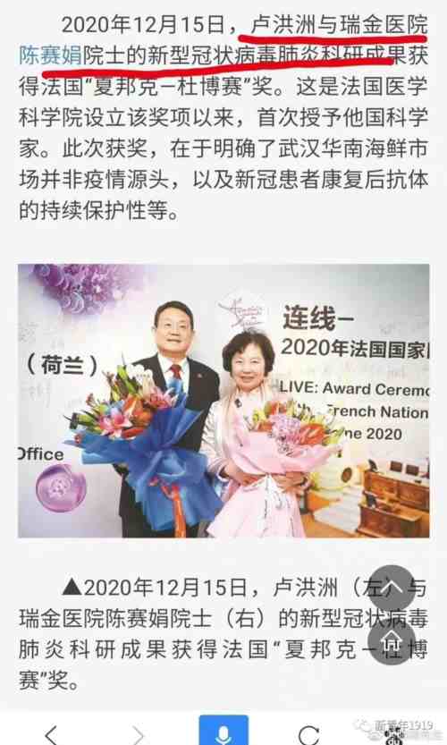 我查了一下陈院士的资料,1951年生,71岁,研究领域是白血病,令人诧异的是,陈院士不仅是这篇论文的通讯作者,而且曾荣获法国颁发的“夏邦克-杜博赛”奖,奖励其在新冠病毒肺炎研究领域取得的科研成果。
