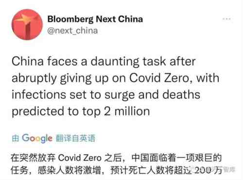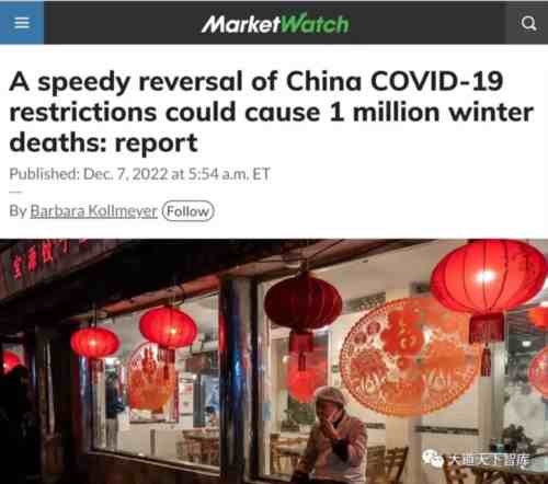 西方敌对势力欣喜若狂。美国大使馆等纷纷停止了签证,美国媒体称中国将快速取代美国(3年感染1亿、死亡109万),成为世界上感染和死亡第一的国家。美国市场观察预测仅仅这个冬天将死亡1百万,彭博社预测预计死亡将超2百万。