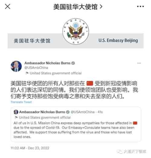 而之前一直指责“中国的疫情防控侵犯人权”的美国政府,来了个一百八十度大转弯。美国驻华大使馆向“饱受病毒之患和失去至亲的人们”表达了深切的同情。