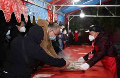 按照疫情防控要求,特意赶来吃面的人们严格保持“一米距”“戴口罩”,有序排队,领取一碗碗热气腾腾的福寿面,隔位而坐,有的游客和群众用环保打包盒,采用了打包带回家吃的方式。