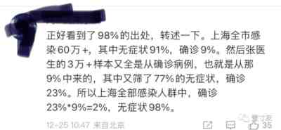 今天他数次来怼我,我觉得也有可取之处,提醒我要更严谨。不能直接说张文宏等论文说98%感染者是无症状,而应该说,张文宏作为感染科专家和沪上防疫领导之一(上海市新冠肺炎医疗救治专家组组长),他领衔的研究数据和结果,与卫生疾控部门的数据摆在一起,很容易让人推导出来了98%无症状并大肆传播。