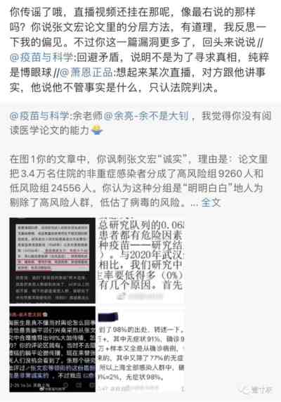 今天还有一位微博大V陶黎纳(@疫苗与科学) ,虽然和陶斯亮相反,想撇清这篇论文所造成的影响,但是和陶思亮一样,偏要把人家已经撤掉的论文拿出来大讲特讲。今天在微博发帖怼我,因为我发了条微博提了一句张文宏等那篇论文搞出了98%的无症状数据。陶黎纳意思是,人家张文宏哪里说98%无症状了,人家说的是80%无症状。