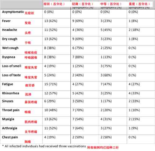 其中详细涉及了各自的无症状比例和症状严重程度。