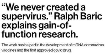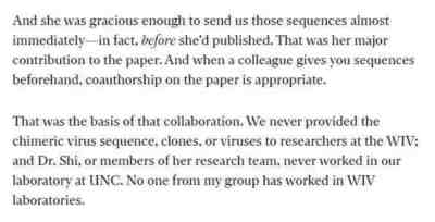 实际上,巴里克自己在采访中做了解释:之所以石正丽团队成为了这篇论文的合著者,是因为该团队给自己分享了蝙蝠体内的原始病毒基因序列。他还明确表示:“我们从未向武汉病毒实验所的研究人员提供过嵌合病毒序列、克隆或病毒,石博士或她的研究团队成员从未在北卡罗来纳大学的实验室工作过,我的团队中没有人在武汉病毒实验室工作过。”