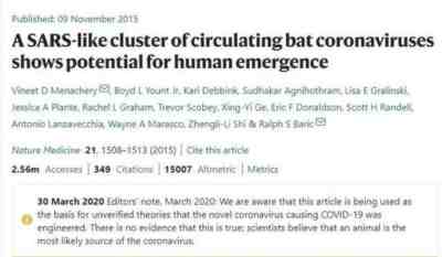 论文同时署上了中国武汉病毒研究所石正丽团队的名字。在新冠疫情暴发后,这篇论文立即被有心人当作了某种未经证实的论调的基础,即新冠病毒是“人为设计”出来的,用于抹黑武汉病毒实验室。