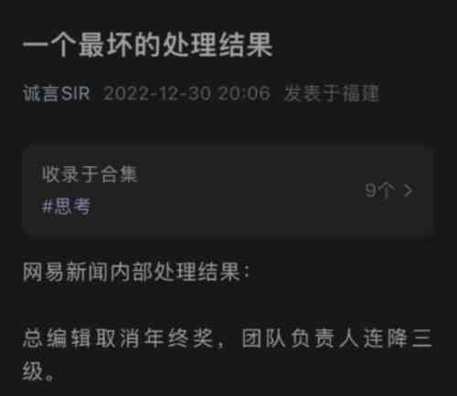 昨天网易新闻搞了个所谓的2022年视频盘点,主要内容是2022年“因为防疫导致的苦难”,并不让人意外的是,这个视频中关于12月之后的情况只字未提。在该视频被删除后,有自媒体声称“网易新闻总编辑取消年终奖,团队负责人连降三级”,又引发一轮共情狂欢,然而此事属于虚构。
