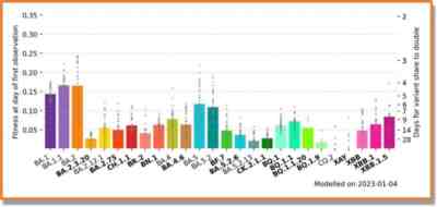 首先,如上所述,现如今毒株内卷的行情,相对于BA.1、BA.2和BA.5冒头的那时候,已经变得更加区域化了,全球层面的倍增时间没法完全代表真正实力。而在重灾区美帝,XBB.1.5已经连续两个半月保持8天翻一番的倍增速度了,简直无情……
