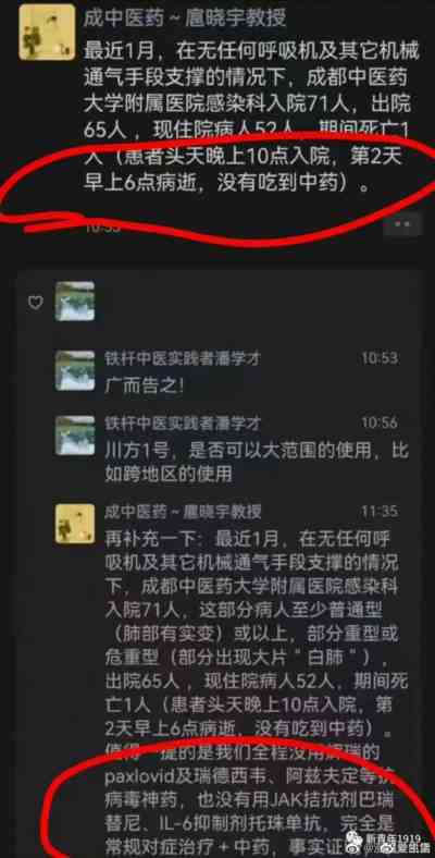 有网友查了扈晓宇教授的资料,早在武汉保卫战的时候,扈教授带领一支四川援鄂队伍接管了武汉协和医院肿瘤中心危重症定点收治的 Z9、Z10重症病区,2月15~3月14日至28天一共收治176例,累计出院141例,其中重症/危重症64例,重症/危重症治愈出院51例(79.7%),所有服用中药的患者(172例)全部存活。由于中医药的提前介入,全程零气管插管,零有创机械通气,零ECMO使用。