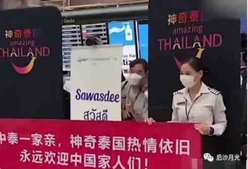 泰国副总理带着两名内阁成员到机场用鲜花欢迎中国游客的到来,泰国机场工作人员还打出了“永远欢迎中国家人们”的标语。“家人们”这梗,泰国人也知道,说明用心了。